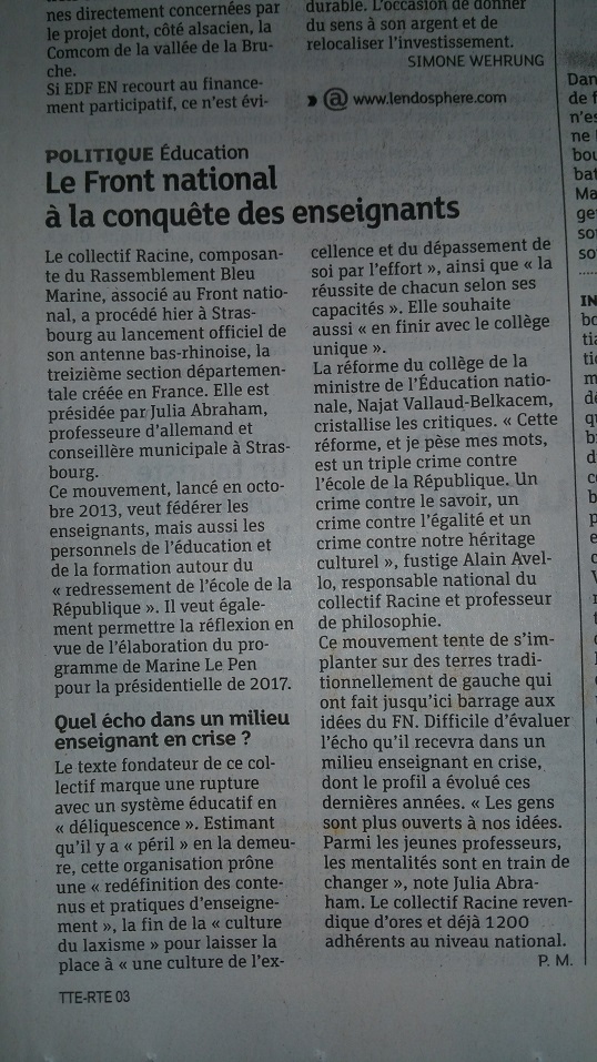 Le 13 juin 2015 a eu lieu, à Strasbourg, le lancement de la 13e section du Collectif Racine : celle du Bas-Rhin (67), en présence de Julia Abraham, responsable de la nouvelle section départementale, d’Alain Avello, secrétaire général du Collectif Racine, d’Andréa Didelot, secrétaire départemental adjoint du FN 67, de Jean-Pierre d’Aigremont, professeur d’arts plastiques en retraite, et de Jean-François Abraham, professeur de physique-chimie.